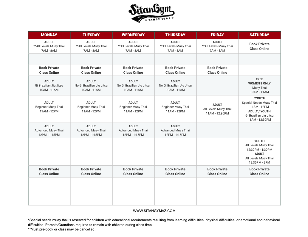 | 5:30pm – 6:30pm | Cadet Muaythai (9-13 years old) |