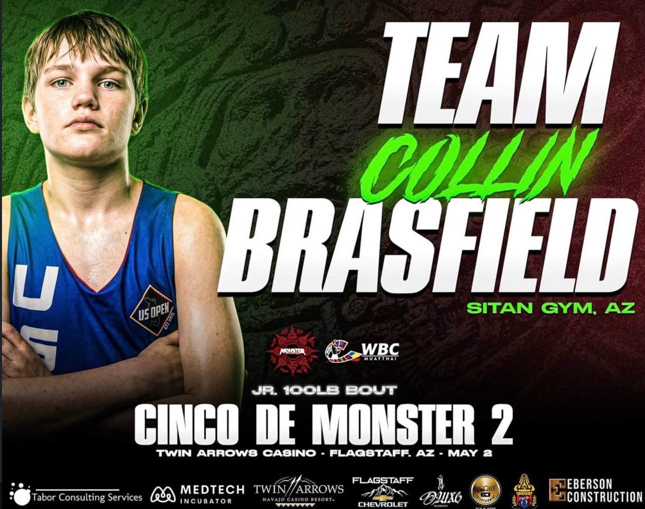 This May, we’re headed to Flagstaff for some exciting fights. Omar and Collin are fighting on Monster Promotion’s Cinco de Monster 2 Card. Weigh ins are Fri 5/1, and fights are Sat 5/2 at Twin Arrows Casino. We have tickets to sell in the office. The gym will be closed Saturday for the fights.